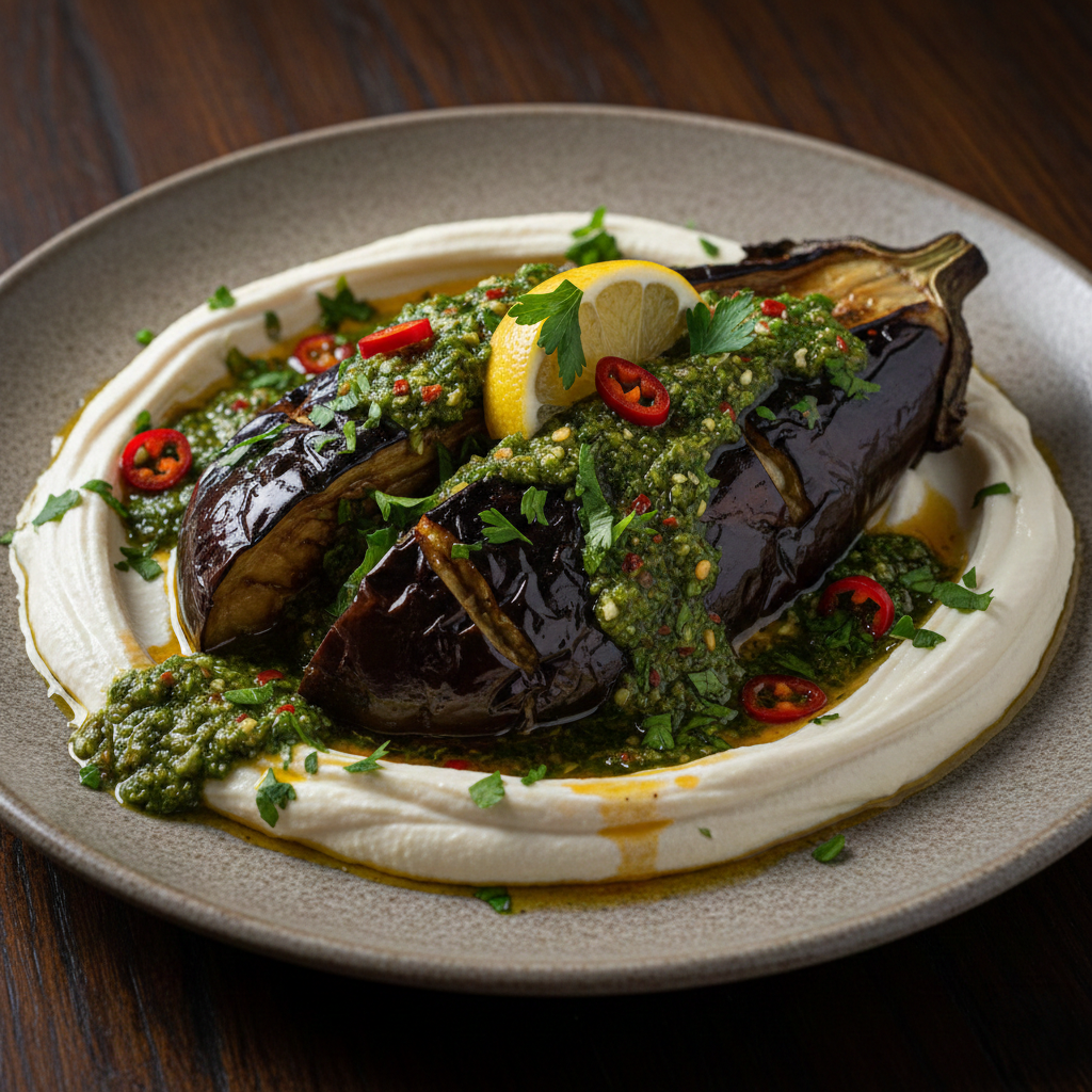 חציל בלאדי חרוך על מצע טחינה סמיכה בתיבול צ'ימיצורי פיקנטי