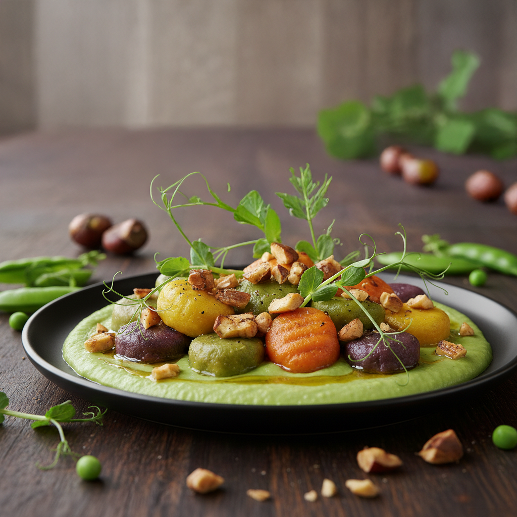 מושחם על קרם ירקות שורש וניוקי צבעוני