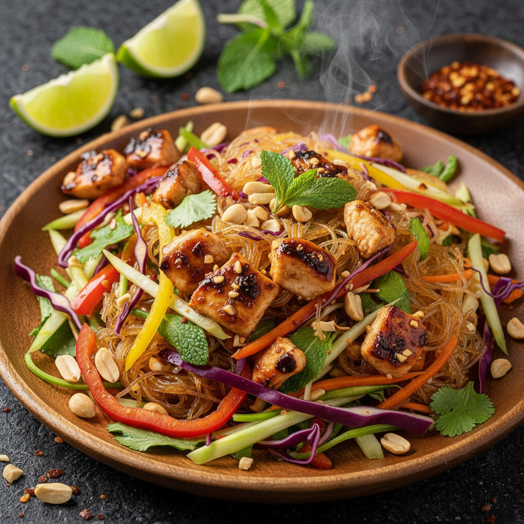 כרוב צבעוני בשילוב אטריות אורז מטוגנות, נתחי עוף צרובים במיסו יפני ובוטנים קלויים