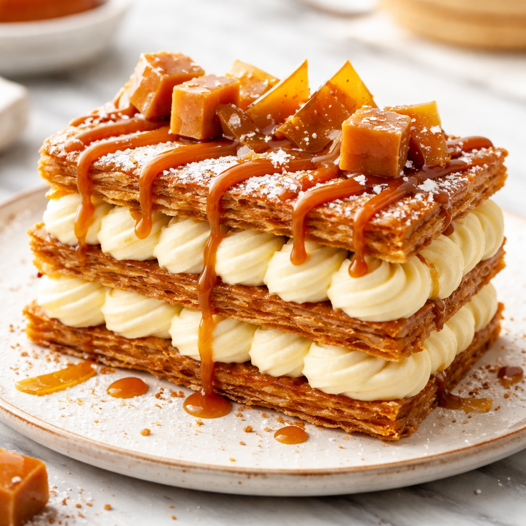 דיסקיות קרם ברולה על דפי עוגיית שקדים, בננות מקורמלות וסירופ קרמל וניל