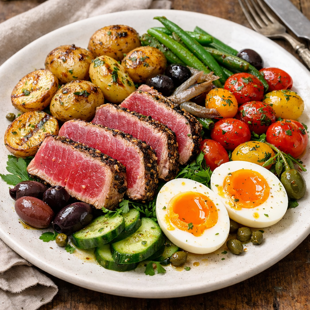 תפוחי אדמה בייבי בגריל, שרי מנומר, טונה אדומה צרובה וביצה רכה
