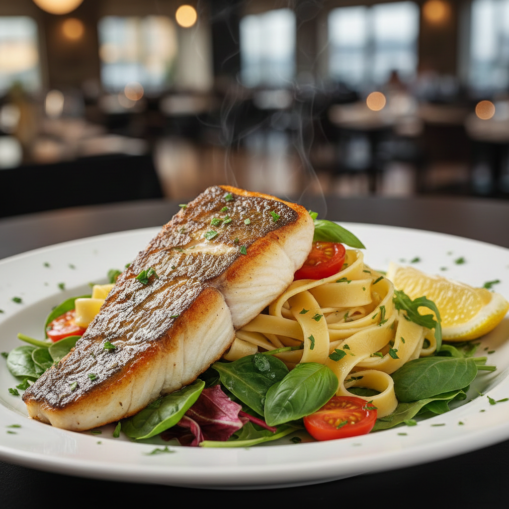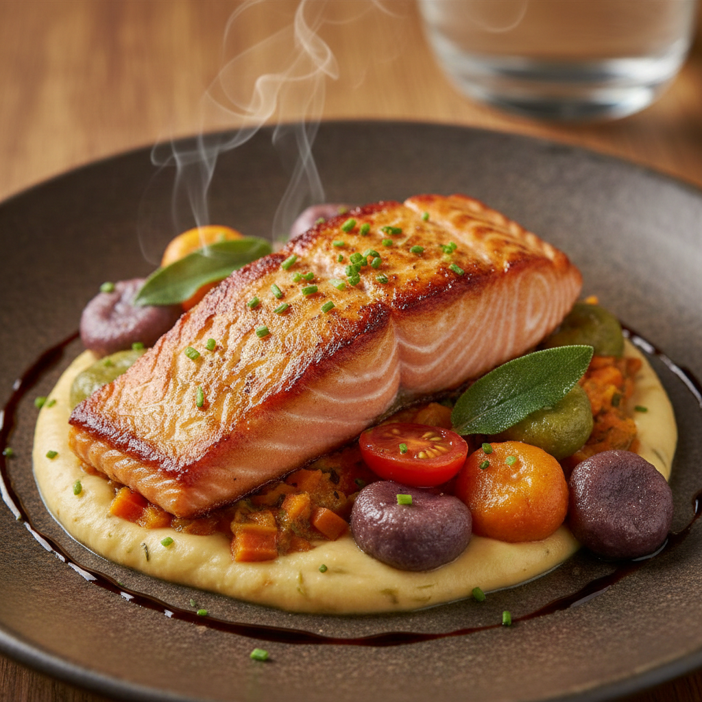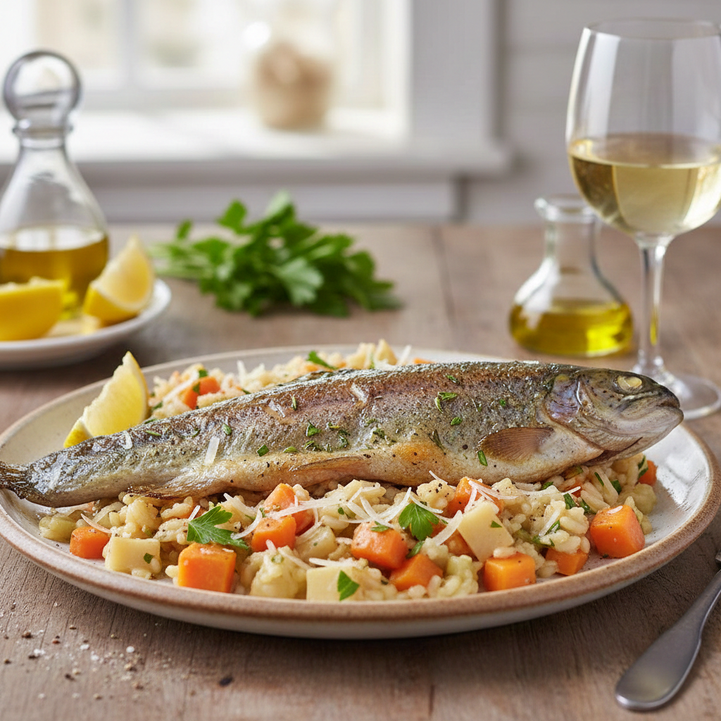 אפוי בשמן זית ומוגש על ריזוטו ירקות שורש