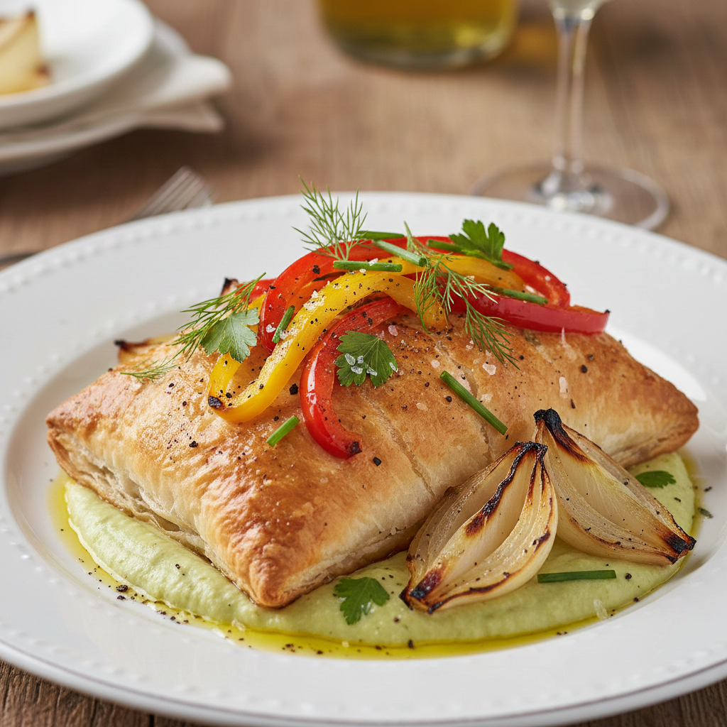 אפוי במעטפת פילו מושחם בתוספת פלפלים קלויים ועשבי תיבול על מצע קרם ארטישוק וגלדי בצל מפוחם