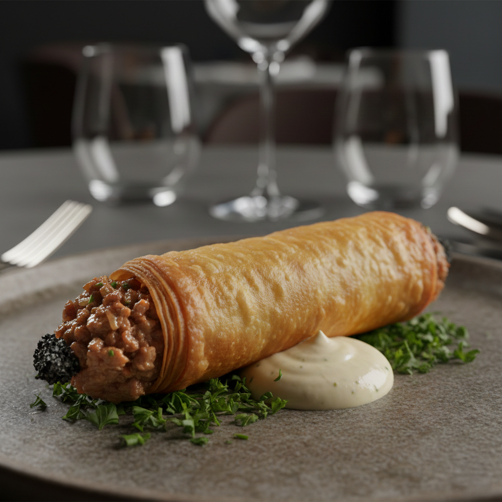 עלי פילו מושחמים במילוי טלה קצוץ, צנובר קלוי, מוגש על חציל שרוף, טחינה לבנה וסילאן תמרים