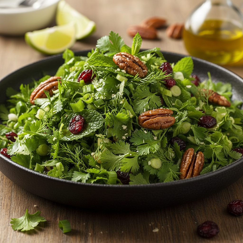 עשבי תיבול קצוצים, פקאנים בקרמל, שמן זית, מיץ ליים וחמוציות