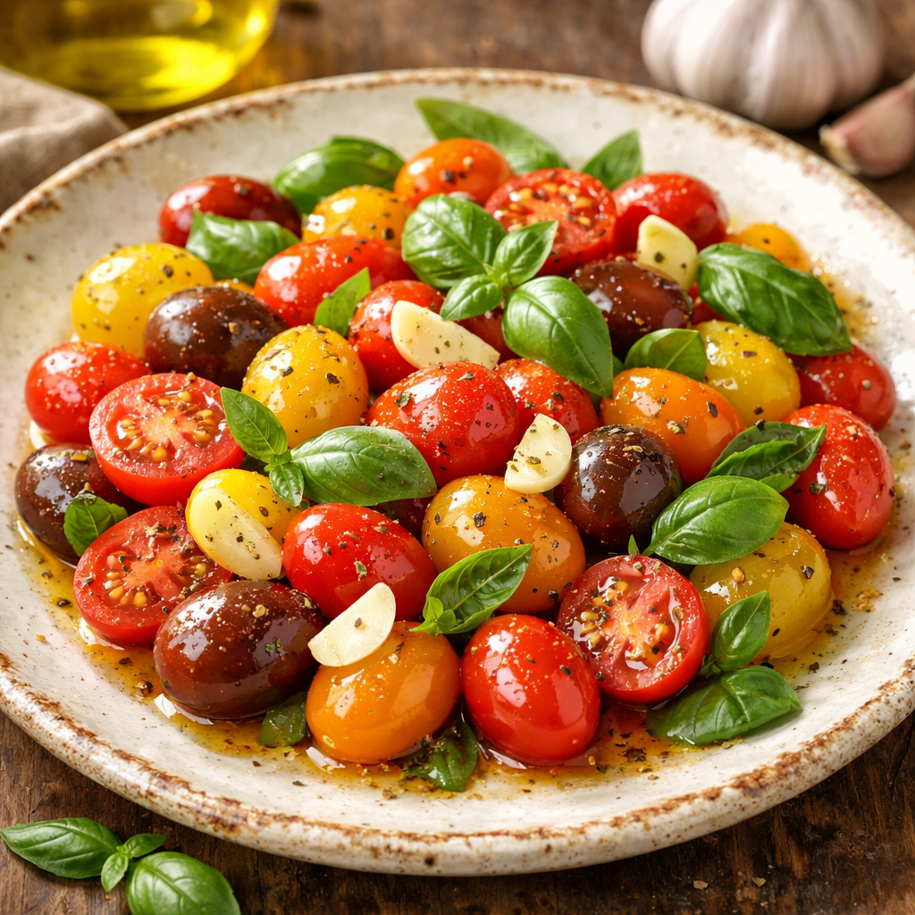 עגבניות שרי במבחר צבעים בליווי עלי ריחן, שום ושמן זית
