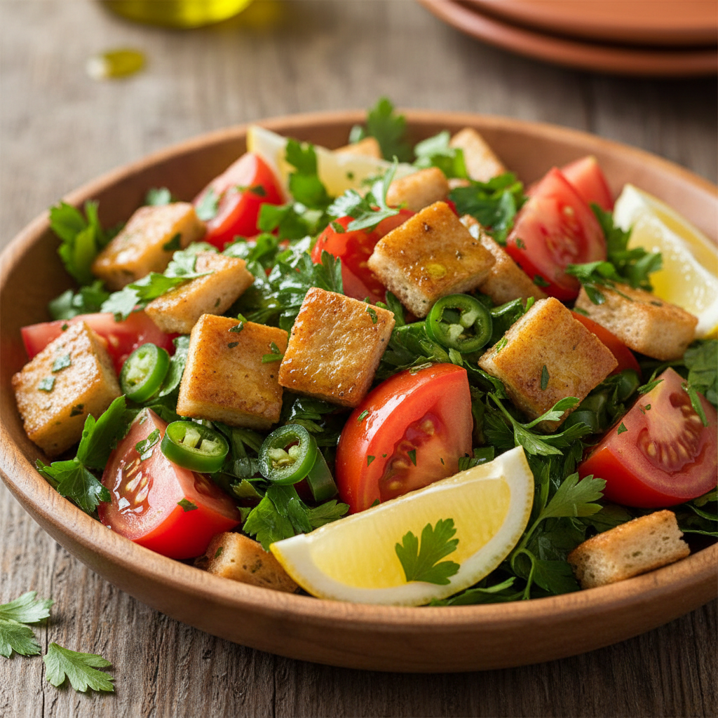קרוטוני לחם קלויים בשמן זית, עגבניות בשלות, פטרוזיליה, פלפל חריף, לימון ושמן זית