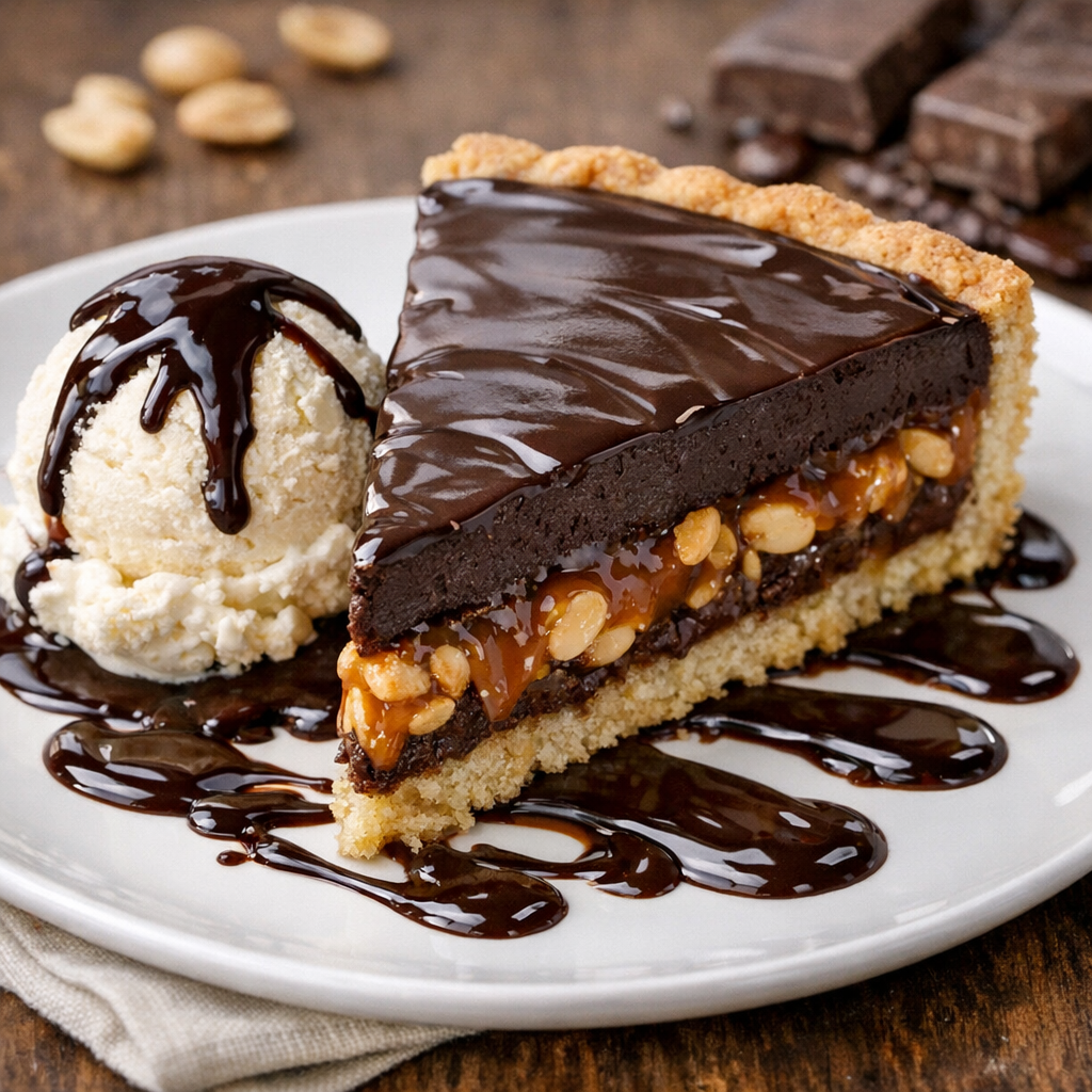 בצק פריך, קרמל בוטנים ושוקולד בשכבות מוגש עם גלידת וניל ורוטב שוקולד