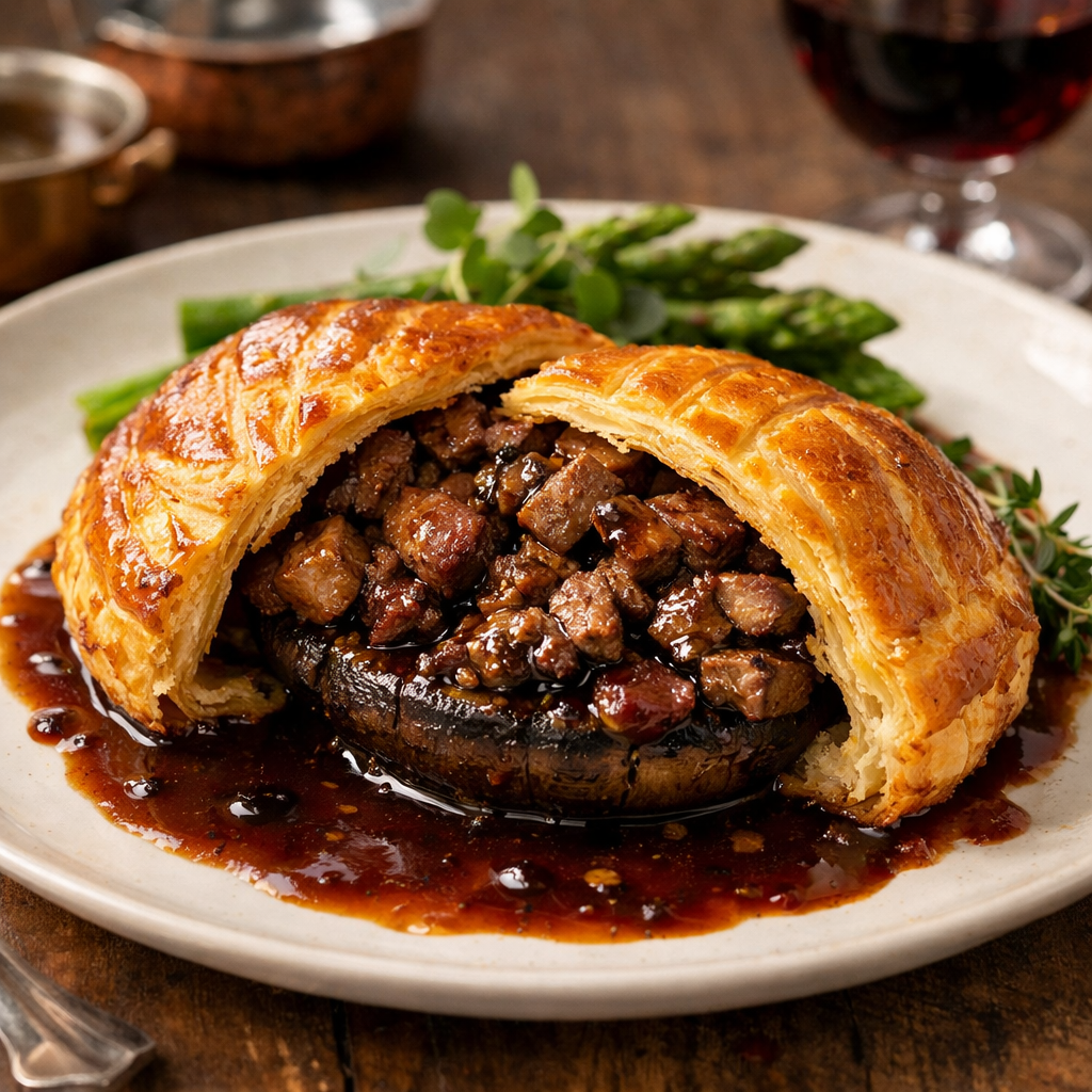 במילוי אנטרקוט וכבד עוף מתובל בציר בקר ויין אדום מוגש במעטפת בצק עלים צרפתי