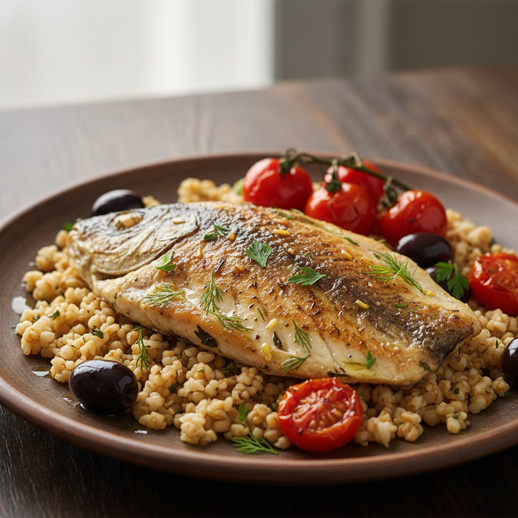 מושחם בתנור על חיטה מעושנת, עגבניות צלויות וזיתי טאסוס