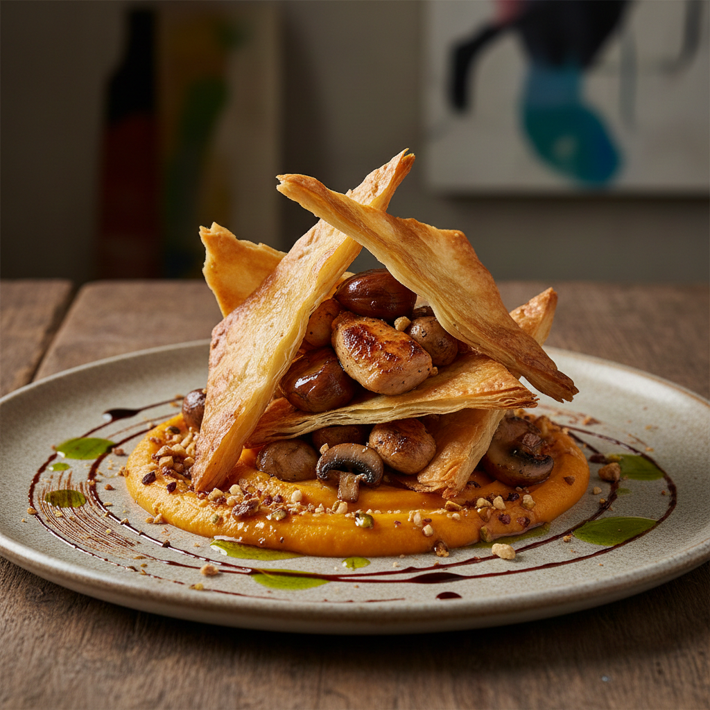 דפי פילו במילוי נתחי פרגית מושחמים, פטריות שמפיניון וערמונים מוגש על קרם בטטה בדבש וגלייז פיצוחים