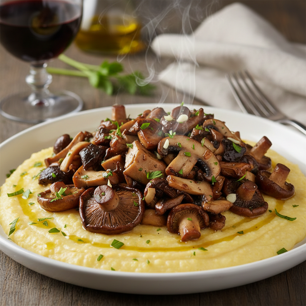 מבחר פטריות יער קלויות בשמן זית על מצע פולנטה רכה